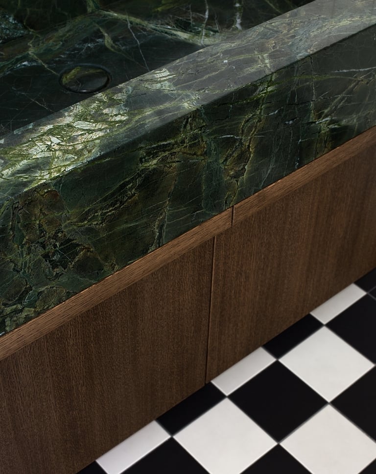 Milda: Idealiu atveju, interjerai yra įgyvendinami dalyvaujant užsakovui, dizaineriui ir akmens specialistui. Gavus idėją, kurią perteikia dizaineris, išsirenkame akmens rūšį, išsprendžiame techninius klausimus, konstruktyvą, jungtis, tada matuojam, skenuojam ir ruošiam gamybinius brėžinius. Su architektais derinam įvairias detales, pavyzdžiui atskirų akmens plokščių rašto tęstinumą. Kartais gaminys atrodo labai paprastas ir lakoniškas, bet yra labai sudėtingai įgyvendinamas dėl mastelio, dėl konstrukcinių sprendinių, svorio, stabilumo. Genialumas yra paprastume.