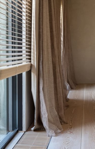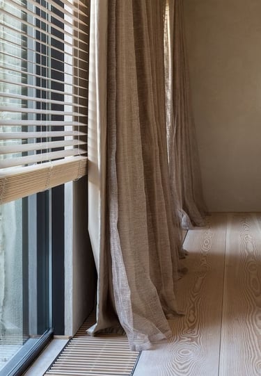 Užuolaidose tikrai galima pasiklysti, ypač kai bandome jomis pridengti vitrinas ir dar mėginame sutalpinti kelis jų sluoksnius. Didelis audinių kiekis paslepia langų kompoziciją, blokuoja šviesą net tada, kai jos trūksta, apkrauna interjerą. Savaime užuolaidos nėra blogis, tiesiog reikia saiko ir paieškoti subtilesnių jų panaudojimo būdų – galbūt užtektų tik vienos plonos lininės, kuri kurtų skaidrumo ir lengvumo jausmą, arba galima ją komponuoti kartu su žaliuzėmis. Tokiu būdu užuolaida suteiks jaukumo ir minkštumo, o žaliuzė, uždegus šviesas, leis pasislėpti nuo akių.