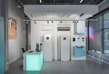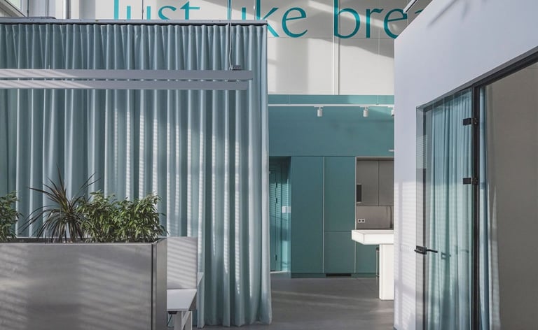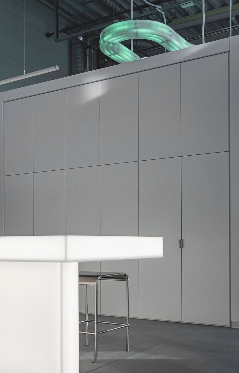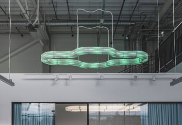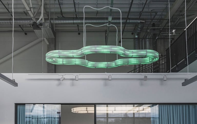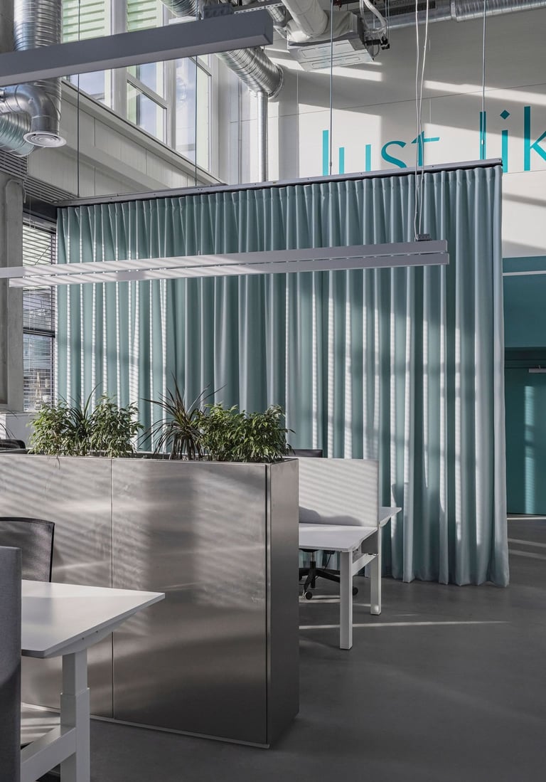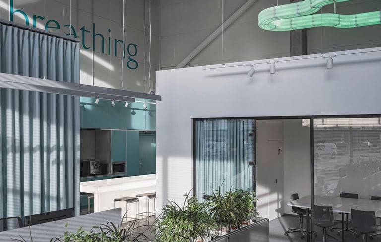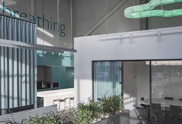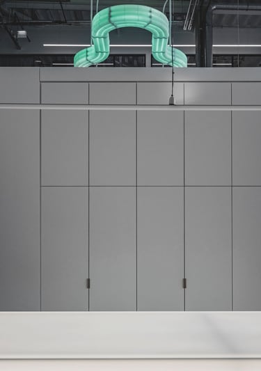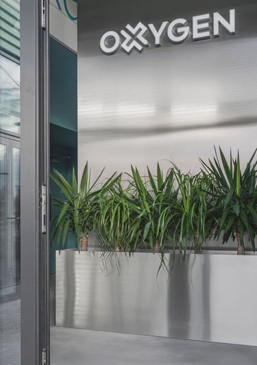 Projektavome ofisą lietuviškų vėdinimo sistemų kūrėjui ir gamintojui Oxygen. Tai modernus, industrinio stiliaus biuro interjeras, kuriame aukštos lubos ir atviri inžineriniai vamzdynai atspindi įmonės veiklą. Poilsio zonoje pagrindinis akcentas - didelis bendras šviečiantis stalas.